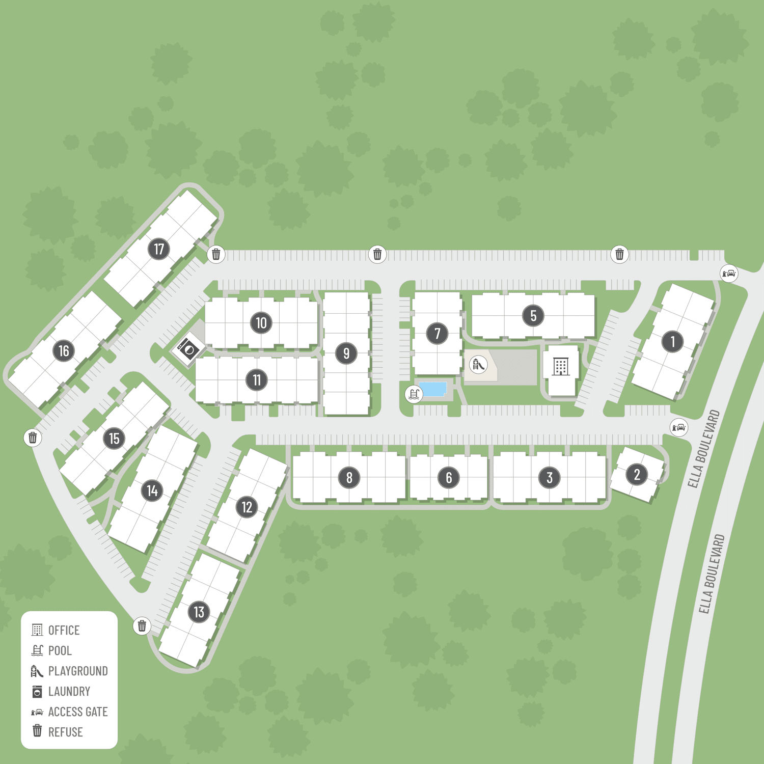 Select a floor plan or bedroom count to view those units on the overhead view on the site map. If you need assistance finding a unit in a specific location please call us at 346-658-5558 TTY: 711.